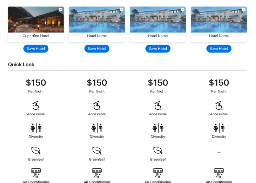 The review table was not easy to parse, causing travelers to struggle to choose the best hotel for them. We adjusted the UI and added the ability to save the best hotel for later review.