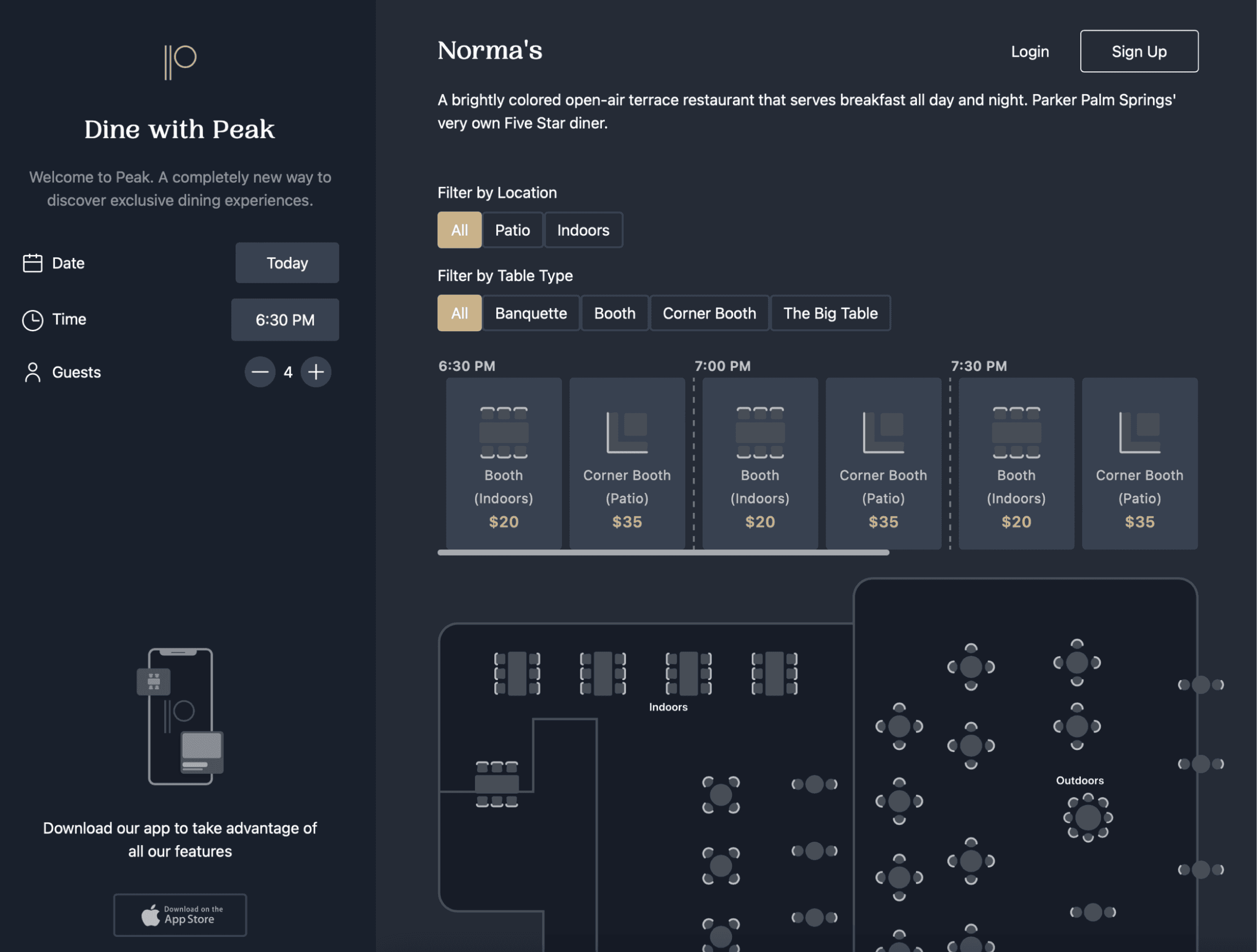 Peak's vision is to give restaurant diners more control when they make a reservation, down to choosing their table. As Lead Designer, I worked in a Product-Design-Engineering trifecta tasked with tackling the application's most critical user-facing page: the available reservations page.